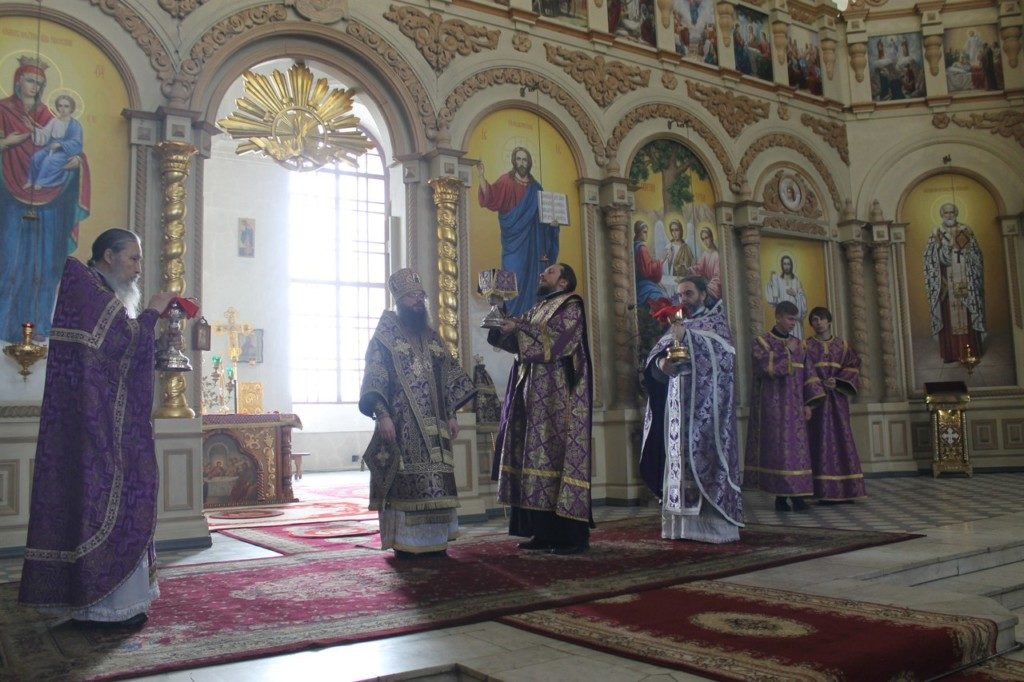 Его Преосвященству сослужили митрофорный протоиерей Петр Васильев, протоиерей Андрей Рыбин, иерей Едесий Чернышов, диакон Серафим Евдокимов и диакон Сергий Петров.